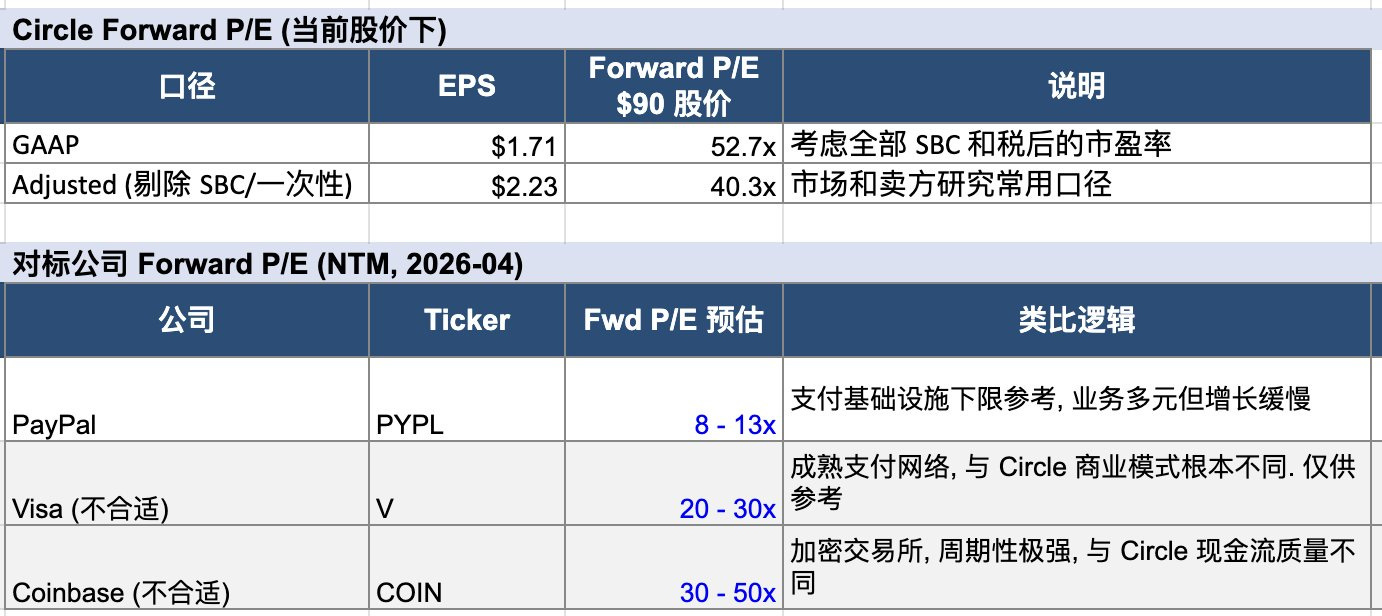 当然,如果你愿意为 Agentic payment、Arc 公链、CPN 网络的叙事买单,可以相信 Circle 值 $110-120+。仅从当前收入分析,市场已经 price in 了 Circle 的平台叙事定价了。