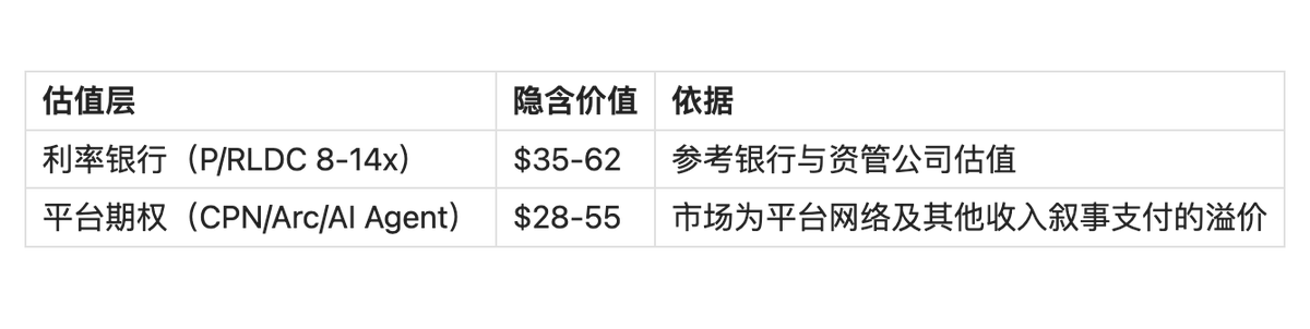 Circle 目前 96% 商业模式是银行利差模式,仅 4% 其他收入接近于金融科技平台。 市场给了 “银行估值+平台梦想” 的双重定价。我们把 $90 拆成两层: