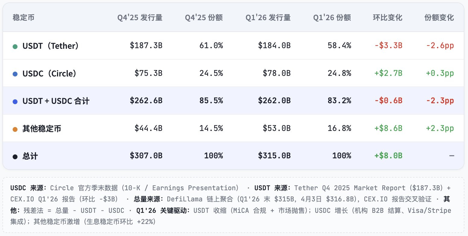 2025 Q4 vs 2026 Q1 稳定币发行商份额(多处汇总数据,口径不同略有小误差)👇
