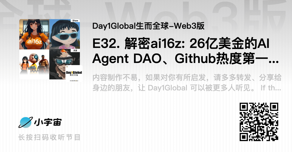 如果你对 AI Agent 赛道、 ai16z、去中心化自治组织DAO 感兴趣,这期播客可以带给你更立体的信息和感受。欢迎收听, enjoy!