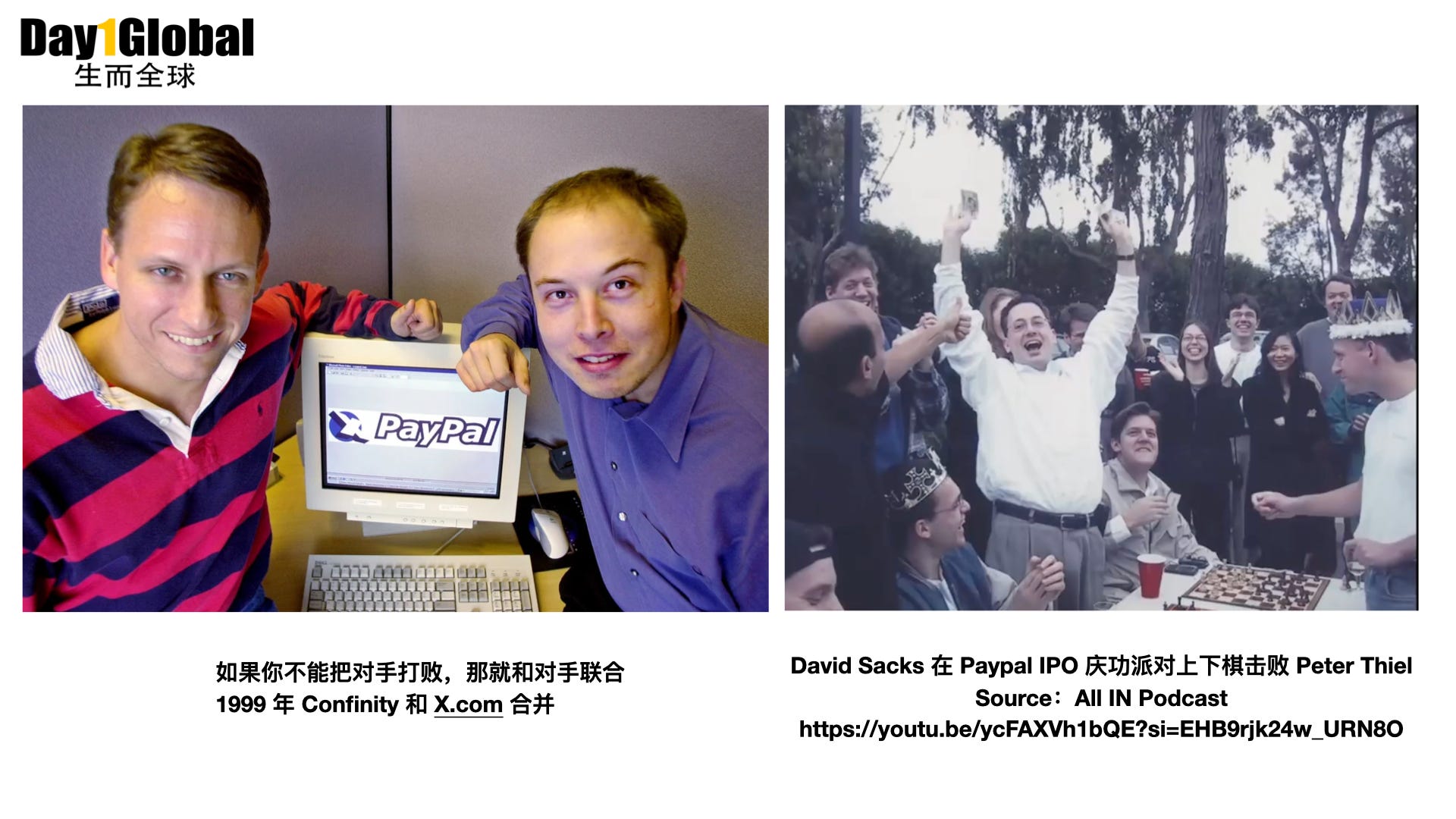 1998年,Peter Thiel投资并加入了马克斯·列夫琴的Confinity公司,后来变成Paypal。1999年,他们与马斯克的x.com合并,一起做大后上市。