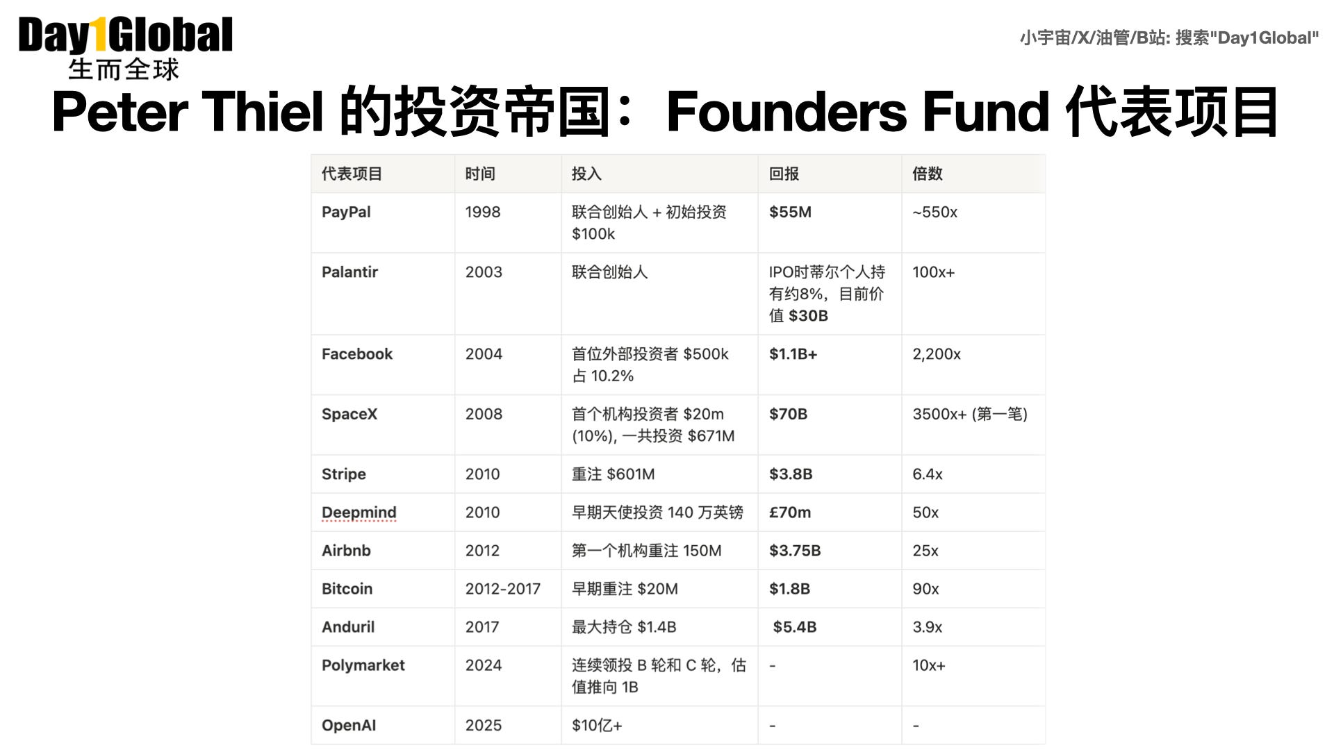 关键动作: 在 SpaceX 只有 PPT 和失败记录时,Thiel 选择押注马斯克的执行力和物理学第一性原理。SpaceX 不仅做到了火箭回收,还通过 Starlink 开启了第二增长曲线。