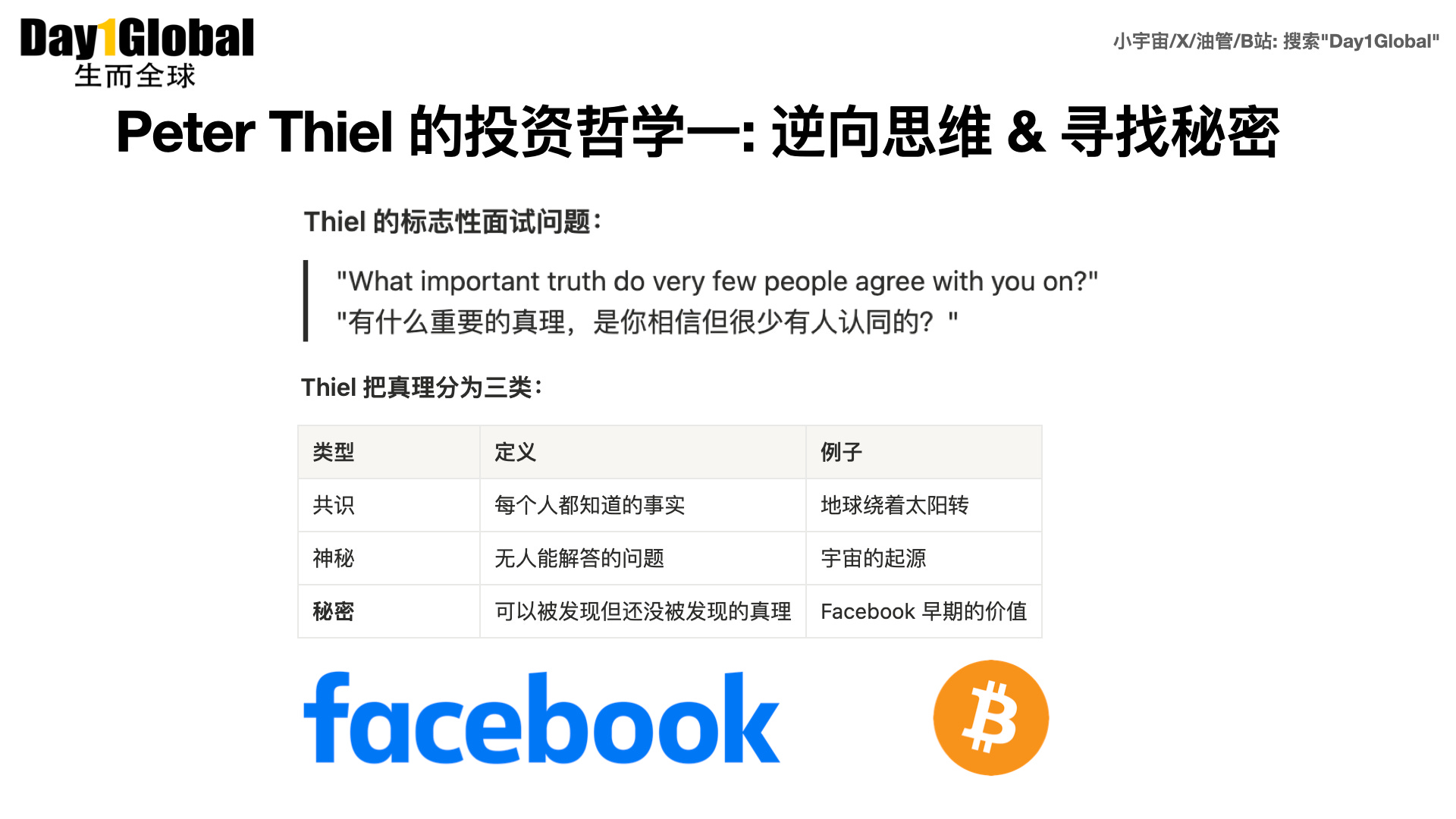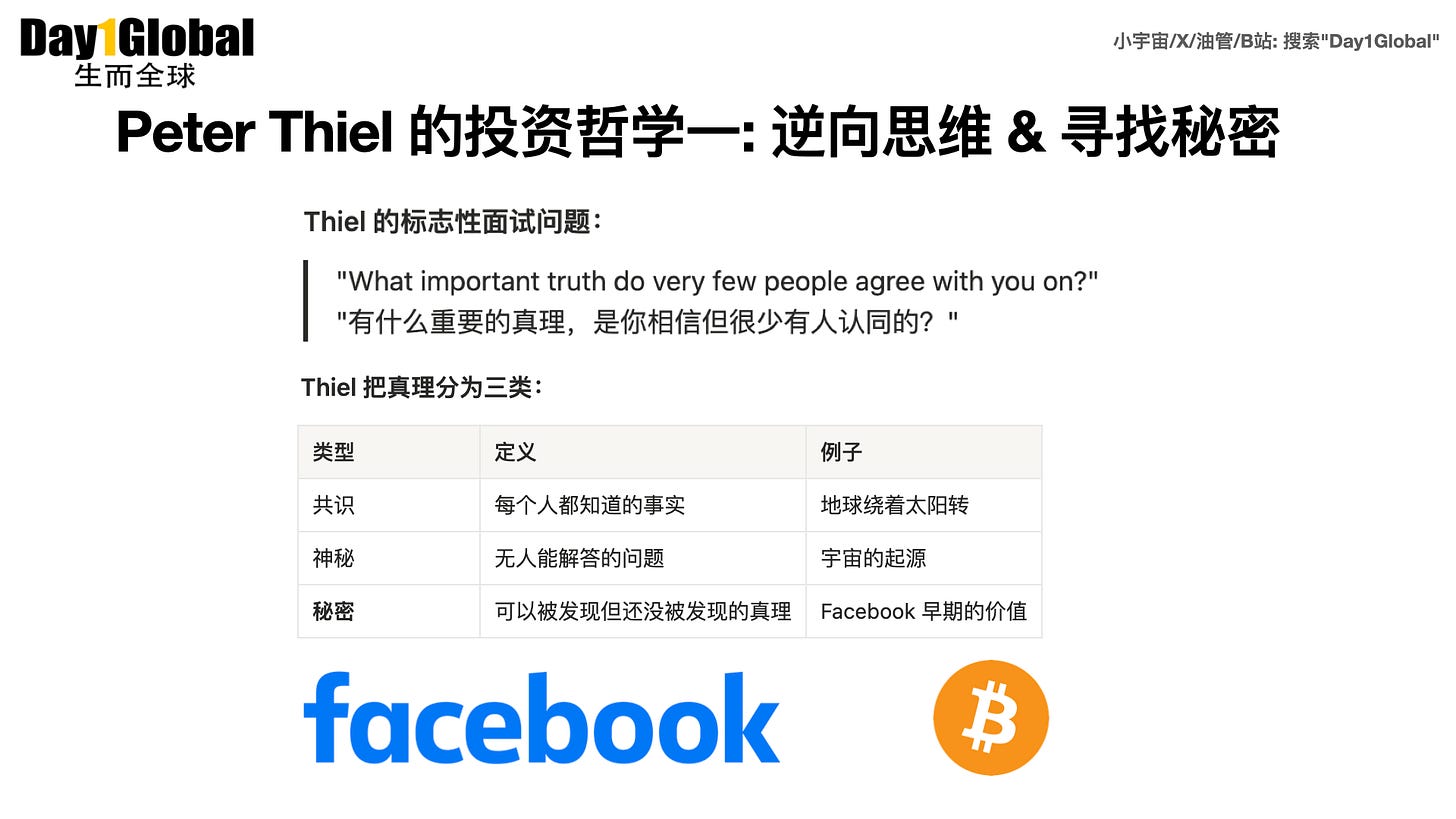 我们花了一周时间深度研究了他的投资版图和投资哲学,发现他有一套非常系统的方法论——其中最出名的一条叫做「发现秘密」:寻找那些很少有人相信但实际上是对的真理。